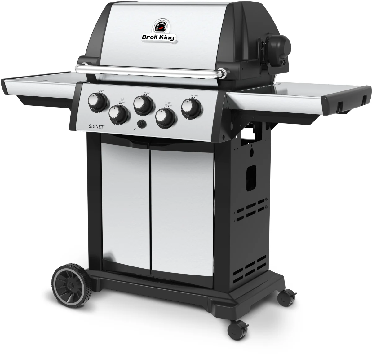 The Signet Series features 2,850 sq. cm primary cooking surface and includes 3 stainless steel Dual-Tube burners, reversible heavy-duty cast iron cooking grids, stainless steel Flav-R-Wave cooking system, and electronic ignition. The Signet series features steel drop-down side shelves, and fully enclosed cabinet base.